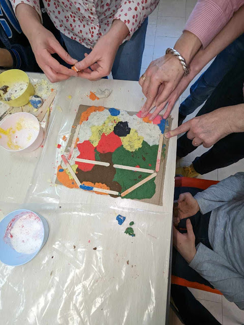Tym razem podczas spotkania wspólnie tworzyliśmy solną wioskę, wzorowaną na wiosce smerfów. W tym celu wykorzystaliśmy własnoręcznie robioną masę solną. Podczas zajęć uczestnicy wyrabiali masę i zmieniali jej kolor łącząc ją z farbami plakatowymi. Następnie tworzyli różnokolorowe domki na kartonach przy pomocy masy i drewnianych patyczków.
