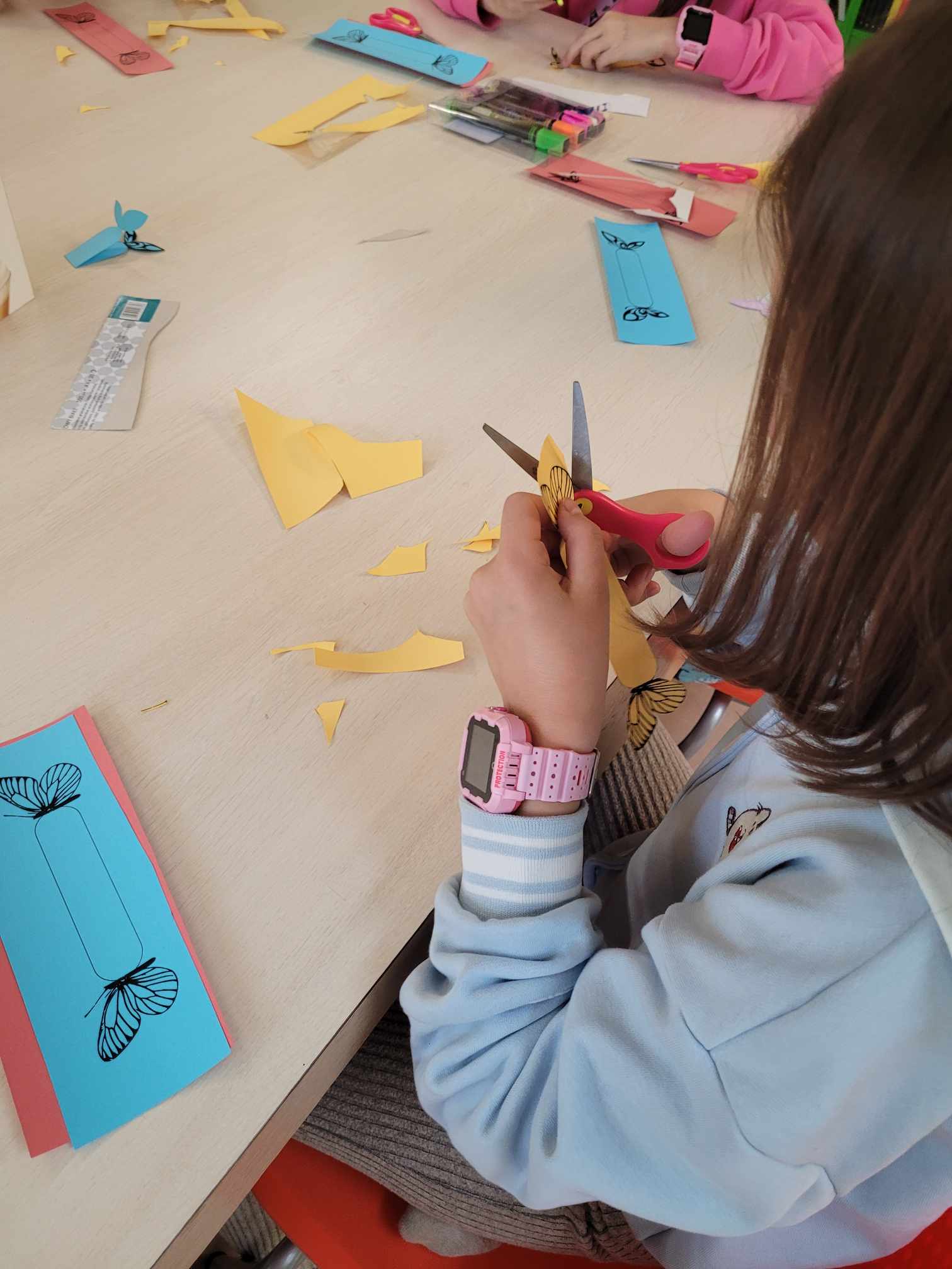 Następnie przeszliśmy do wykonywania pracy plastycznej. Były to zakładki w kształcie motyli. Podczas pracy przeprowadziliśmy dyskusję o popularnych seriach książkowych dostępnych w naszej bibliotece, m.in. serii ,,Wojownicy".